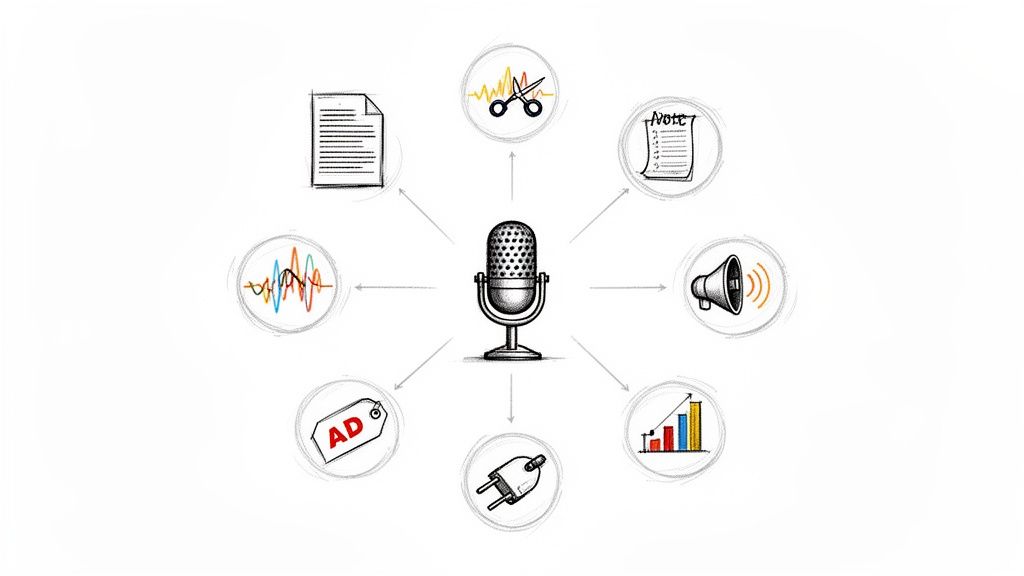 This guide breaks down the 12 essential AI tools that can transform your podcast production process, from initial recording to final promotion. We have organized these platforms into clear categories to help you find the right solution for your specific needs, whether you're a developer seeking an affordable transcription API or a creator looking for an all-in-one editing suite.